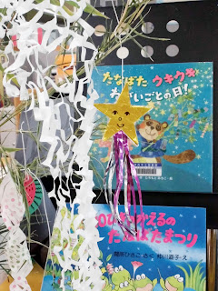 七夕までは七夕の絵本が展示されています。お星さまが見ていますよ!